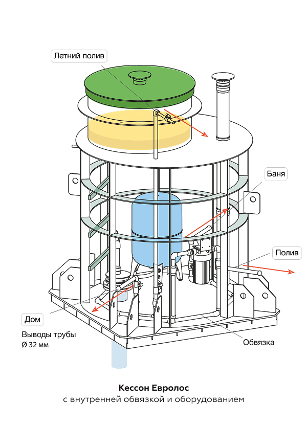 На практике же большинство домовладельцев сталкиваются с ситуацией, когда скважина располагается на участке, который уже застроен. Скважины часто бурятся в первую очередь, еще до начала строительства, чтобы обеспечить водоснабжение для проведения бетонных и строительных работ. Летом, когда уровень грунтовых вод снижается, оголовок скважины можно оставить открытым, установив его выше уровня земли. Однако с наступлением зимы такую систему нужно консервировать, иначе возможны дорогостоящие повреждения. Для предотвращения таких рисков и обеспечения круглогодичной подачи воды необходим кессон — специальное подземное резервуарное сооружение, которое защищает оборудование от внешних факторов и гарантирует его стабильную работу.