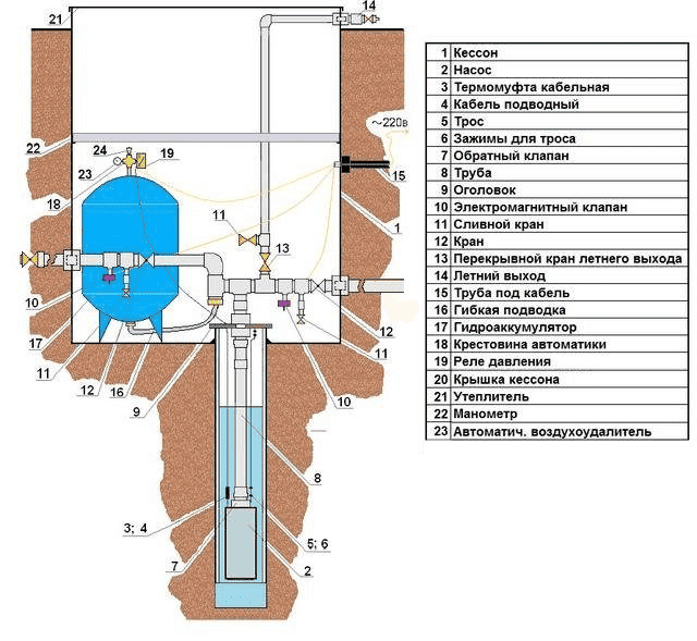 Чтобы понять, что такое кессон для скважины на воду и почему его обустройство играет ключевую роль, важно разобраться в принципах работы автономных систем водоснабжения. Вода из скважины поднимается насосом, затем с помощью под давлением транспортируется по трубопроводу в дом. Для того чтобы система функционировала бесперебойно, поддерживая нужный напор, устанавливаются гидроаккумулятор и реле давления, а также необходимые датчики, обеспечивающие корректную работу всех элементов. Все это оборудование требует отдельного места для размещения.