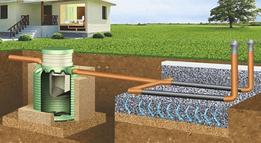 В септиках проточного типа очищение стоков происходит за счет анаэробных бактерий. После предварительного осветления стоков, вода из септика должна направляться в дренажный элемент, на аэрационное поле или фильтрационную траншею, где стоки проходят дополнительную очистку грунтом.