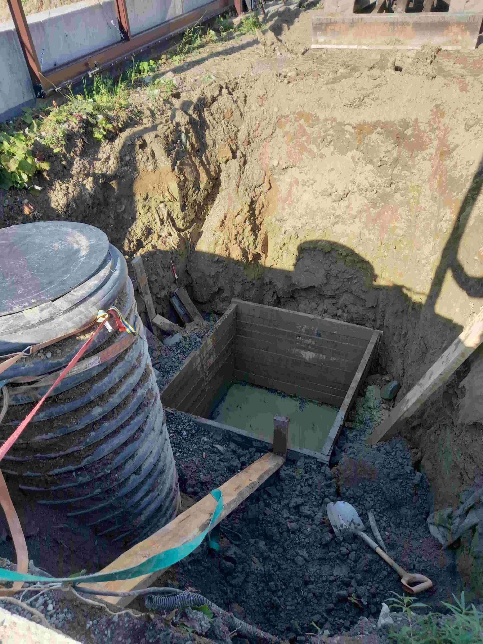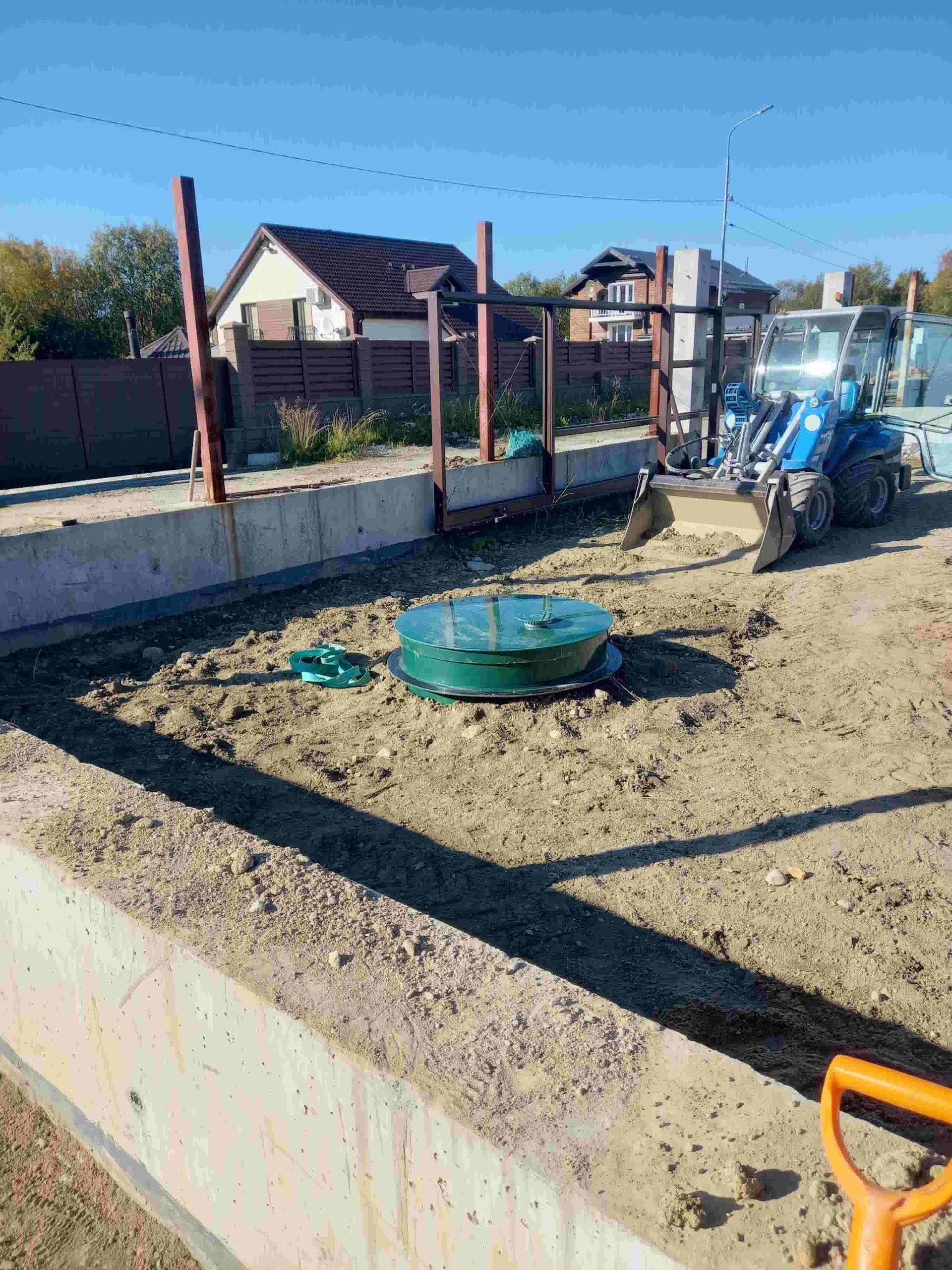 Выкапываются котлован под очистное сооружение и траншеи для трубопроводов. Затем устанавливается само очистное сооружение, и укладываются подводящие и отводящие трубопроводы.