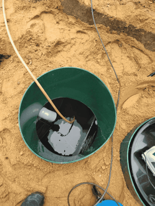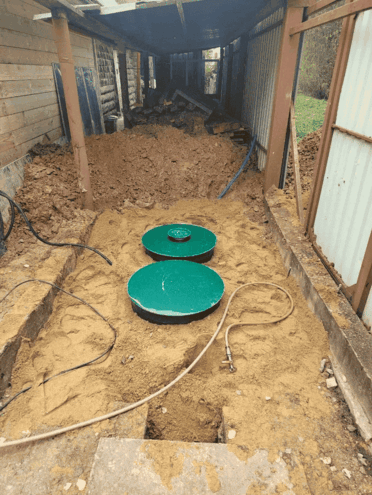 Выкапываются котлован под очистное сооружение и траншеи для трубопроводов. Затем устанавливается само очистное сооружение, и укладываются подводящие и отводящие трубопроводы.