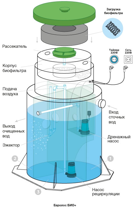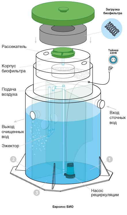 Конструкция Евролос Био представляет из себя цилиндр с горловиной, выполненный из монолитного полипропилена. Внутри цилиндра с помощью перегородок выделены три камеры, последовательно сообщающиеся между собой через щели и патрубки в перегородках, расположенные на определенной высоте.